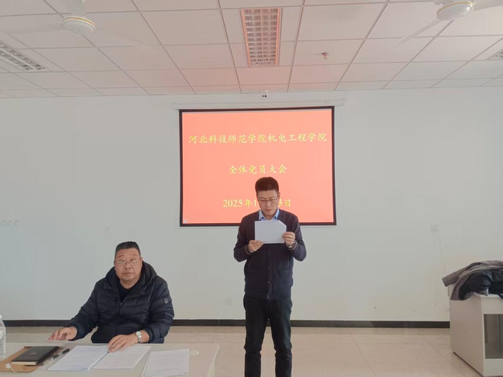 2025年11月13日,机电工程学院党委在开发区校区B204召开全体党员大会,选举产生了中共河北科技师范学院委员会第四次党代表党代表。会议由学院党委书记主持,全体党员参会。