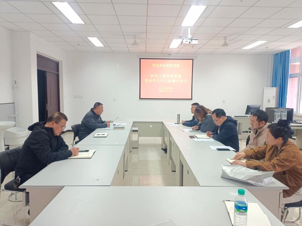 2026年4月16日下午,机电工程学院党委理论学习中心组在开发区校区实训楼B204召开集中学习会议。学院领导班子成员、党委委员、各党支部书记参加学习,会议由学院党委书记主持。此次学习聚焦《习近平:牢牢把握雄安新区功能定位 努力建设新时代创新高地和推动高质量发展样板》和《习近平总书记地方工作期间坚持正确政绩观生动实践》等内容,通过集体学习、交流研讨和会后自学相结合的方式,进一步统一思想、凝聚共识、明晰方向。